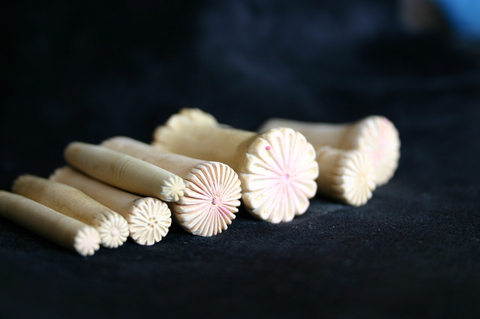 花や線紋などの模様をかたどった印を用意し、まだ少し柔らかさが残る素地に押して模様を付けます。単調にならないように、印の大小や模様の組合せのセンスが重要な要素です。